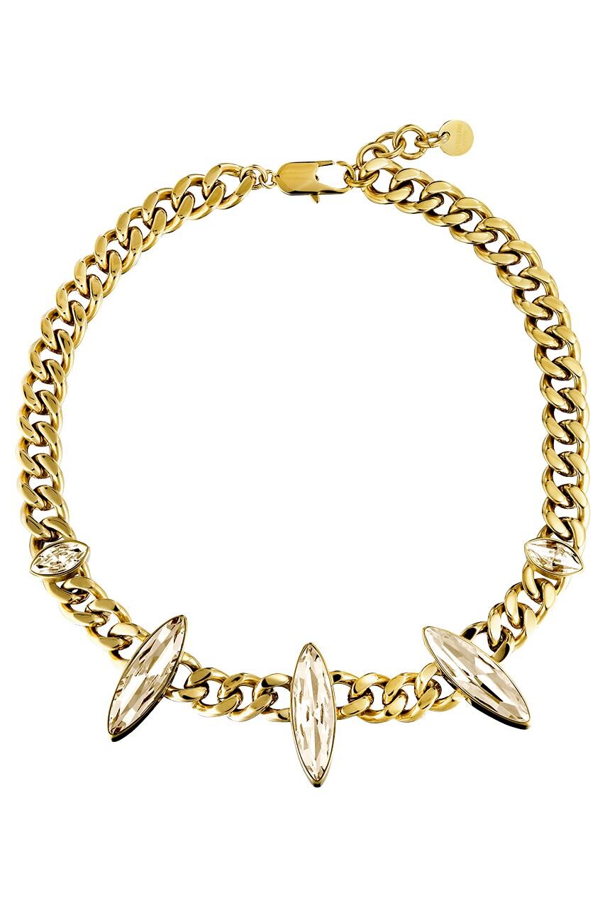 Smykkefeber har fundet Dyrberg Kern Opsica Halskæde Farve: Guld Onesize Dame fra Dyrberg Kern hos Dyrberg/Kern i kategorien Halskæde. OPSICA – er en fed, kort halskæde, der ligger smukt i halsrundingen med sine 42 cm længde + 5 cm. forlængerkæde. Super opsigts vækkende og samtidigt meget chic. Kæden er designet i poleret stål, og de fem store og mindre navette formede krystaller er mege